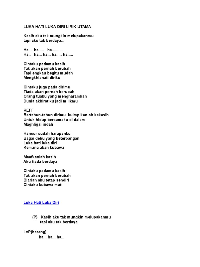 Cintaku padamu kasih Tak akan pernah berubah Biarlah aku tetap sendiri Cintaku kubawa mati. Download Lagu Luka Hati Luka Diri MP3 Tidak Ada di Halaman Ini. See more of Kumpulan lirik lagu on Facebook.